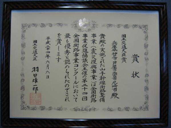 本市が震災復興事業として取り組んできた山手幹線街路事業において、全国街路事業促進協議会主催の第24回全国街路事業コンクールに平成22年度に完成した「山手幹線街路事業」を応募していたところ、平成24年6月6日に、兵庫県及び関係市とともに最高賞である国土交通大臣賞を受賞しました。