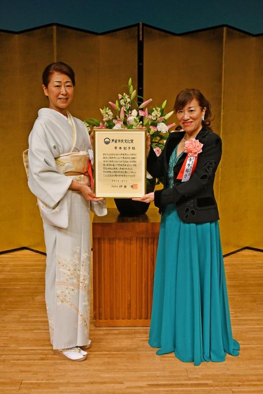 令和3年度第55回芦屋市民文化賞受賞者は、声楽家・ソプラノ歌手の寺本郁子氏に決まりました。この賞は昭和42年に制定され、学術・科学・教育などの研究実践や芸術・芸能・体育などの活動を通して市民文化の向上発展に貢献されたかた、また、地域社会の発展につくされ、その功績が顕著なかたに対して市民の感謝を込めて表彰するもので、今年度は11月7日「市制施行80周年記念式典」でいとう市長から賞状、記念品、花束を贈呈しました。
