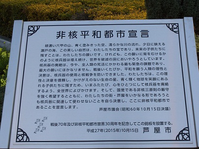 本市では、戦後70年、昭和60年10月15日に芦屋市議会が「非核平和都市宣言」を決議してから30周年を記念して、平成27年10月18日(日曜日)に市役所北館前広場の花壇に、宣言文の記念銘板を設置し除幕式を執り行ないました。