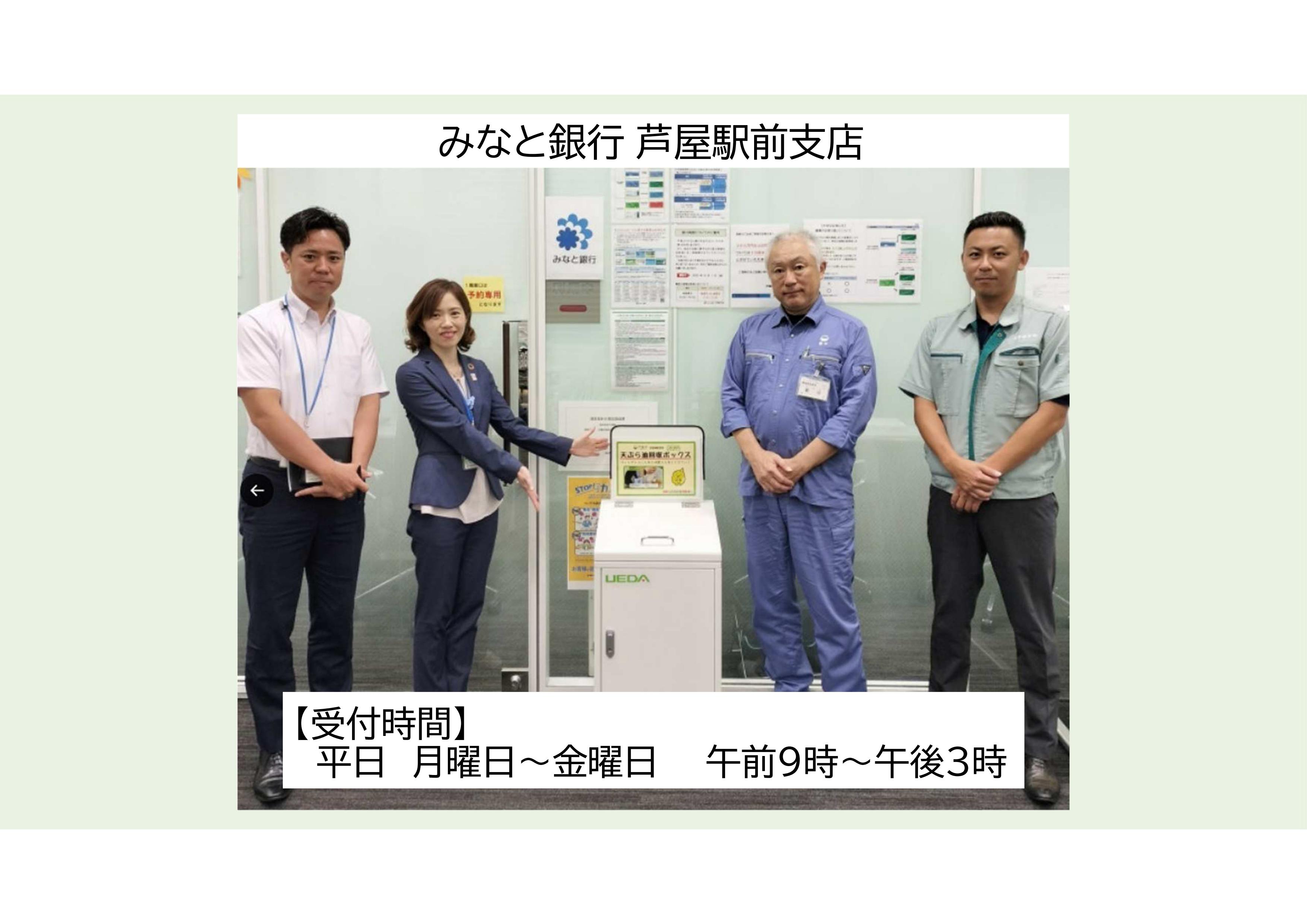 植田油脂株式会社より、廃食用油の回収ボックスを提供いただいています。現在、芦屋市役所北館玄関口のほか、計18か所に設置していますので、お立ち寄りの機会に、お気軽にお持ちください!