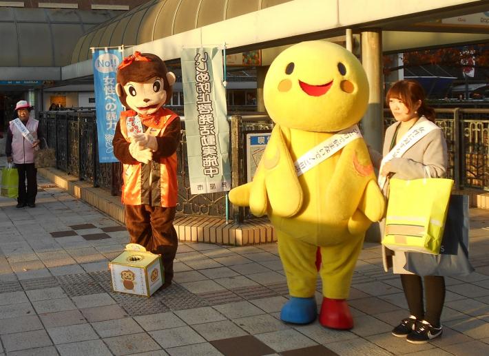 はばタンやあしモンも一緒に啓発リーフレットとグッズを手渡し、多くの方に「女性に対する暴力をなくす運動」、「児童虐待防止」、「いじめ防止」について知ってもらう良い機会となりました。