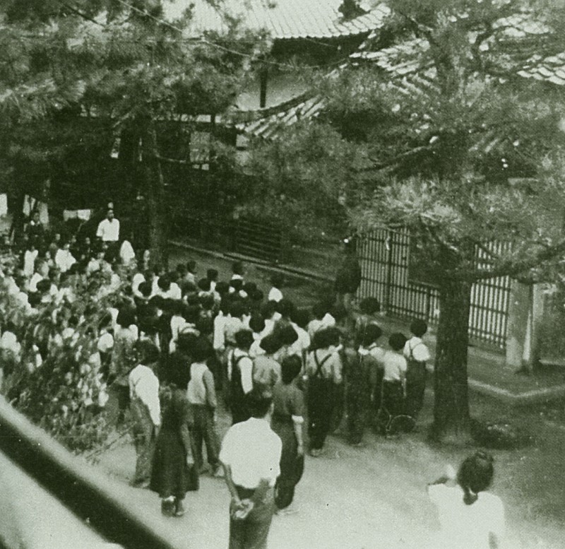 ホーム > 市政 > 広報 > 芦屋ギャラリー【芦屋市公式インスタグラム】【思い出写真館】 > 芦屋思い出写真館 > 芦屋 思い出写真館【戦時下の芦屋の暮らし】 > 昭和20年8月、疎開先の頼久寺(岡山県高梁市)で終戦の放送に聞き入る児童