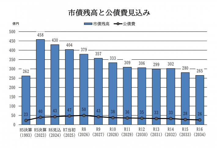 市債残高は、阪神・淡路大震災により平成13年度にはピークとなる1,119億円まで増えました。その後、借入抑制や積極的な繰り上げ償還を実施した結果、令和5年度末に458億円まで減少しました。令和5年度以降は、令和11年度まではなだらかに減少し、その後横ばいとなり、令和16年度末には265億円となる見込みです。